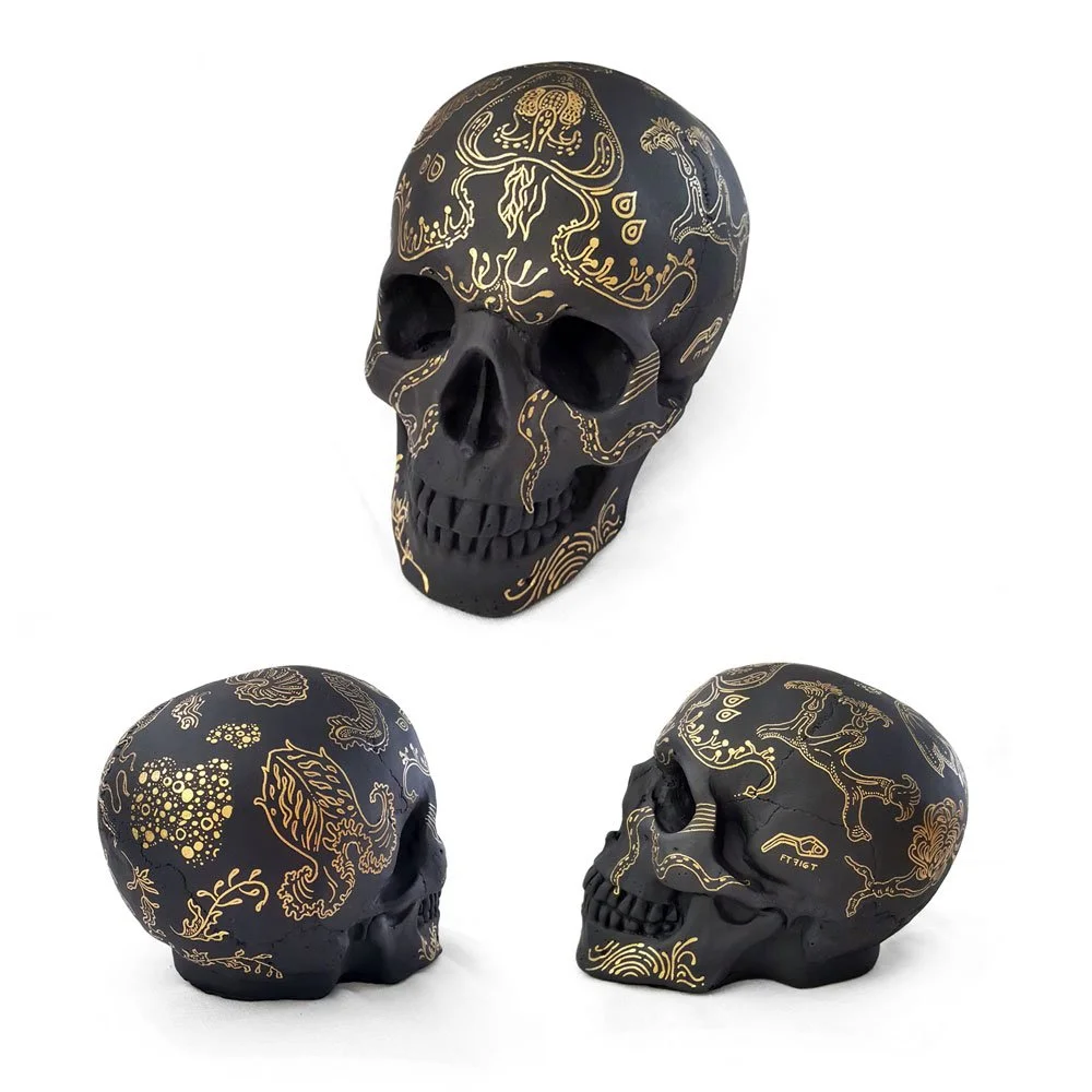 Three hand-painted, anatomically accurate plaster skulls created as a special commission for a group of neurosurgeon friends. Each piece is uniquely detailed to describe each doctor’s specialization and personal interests.